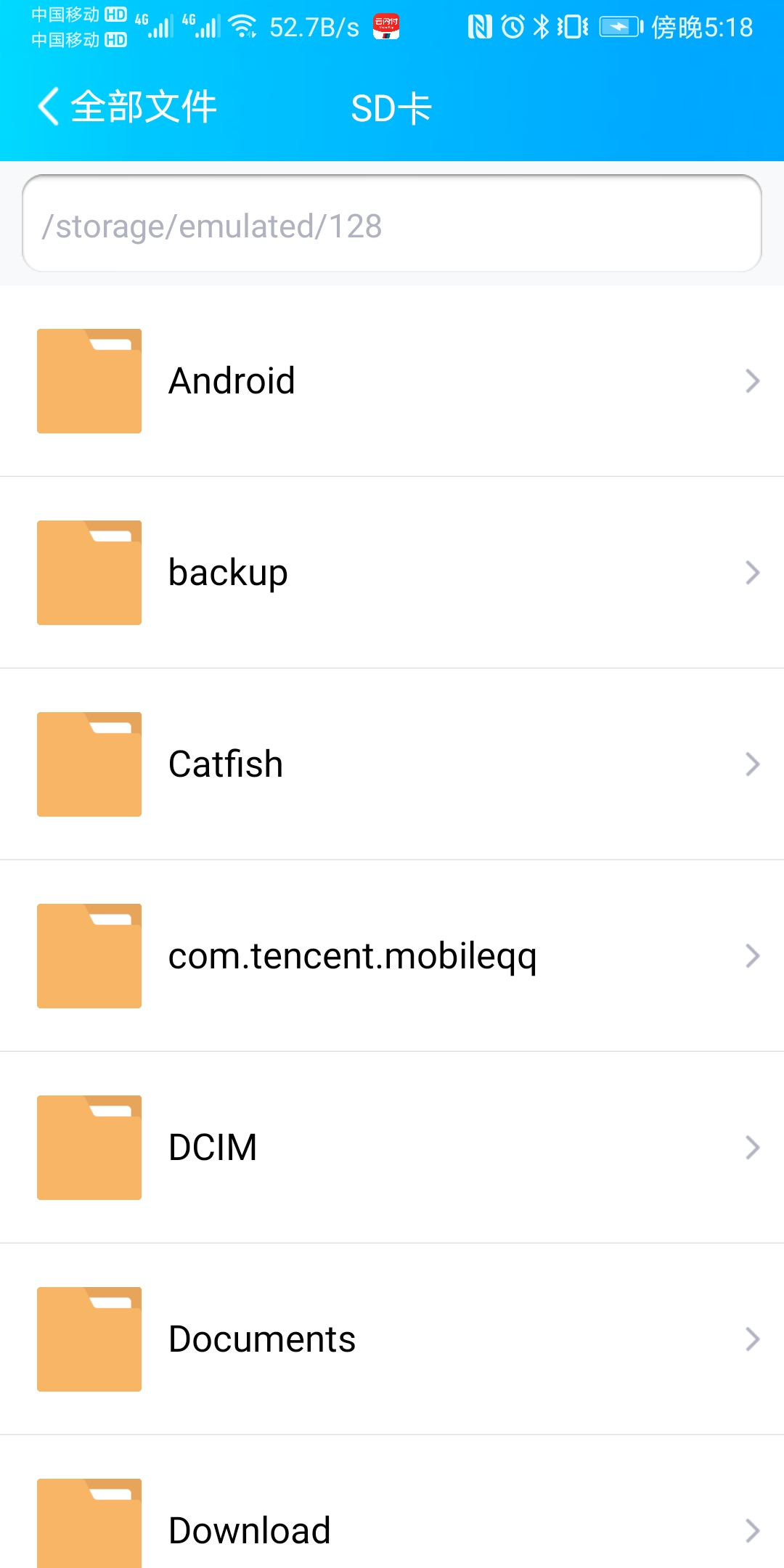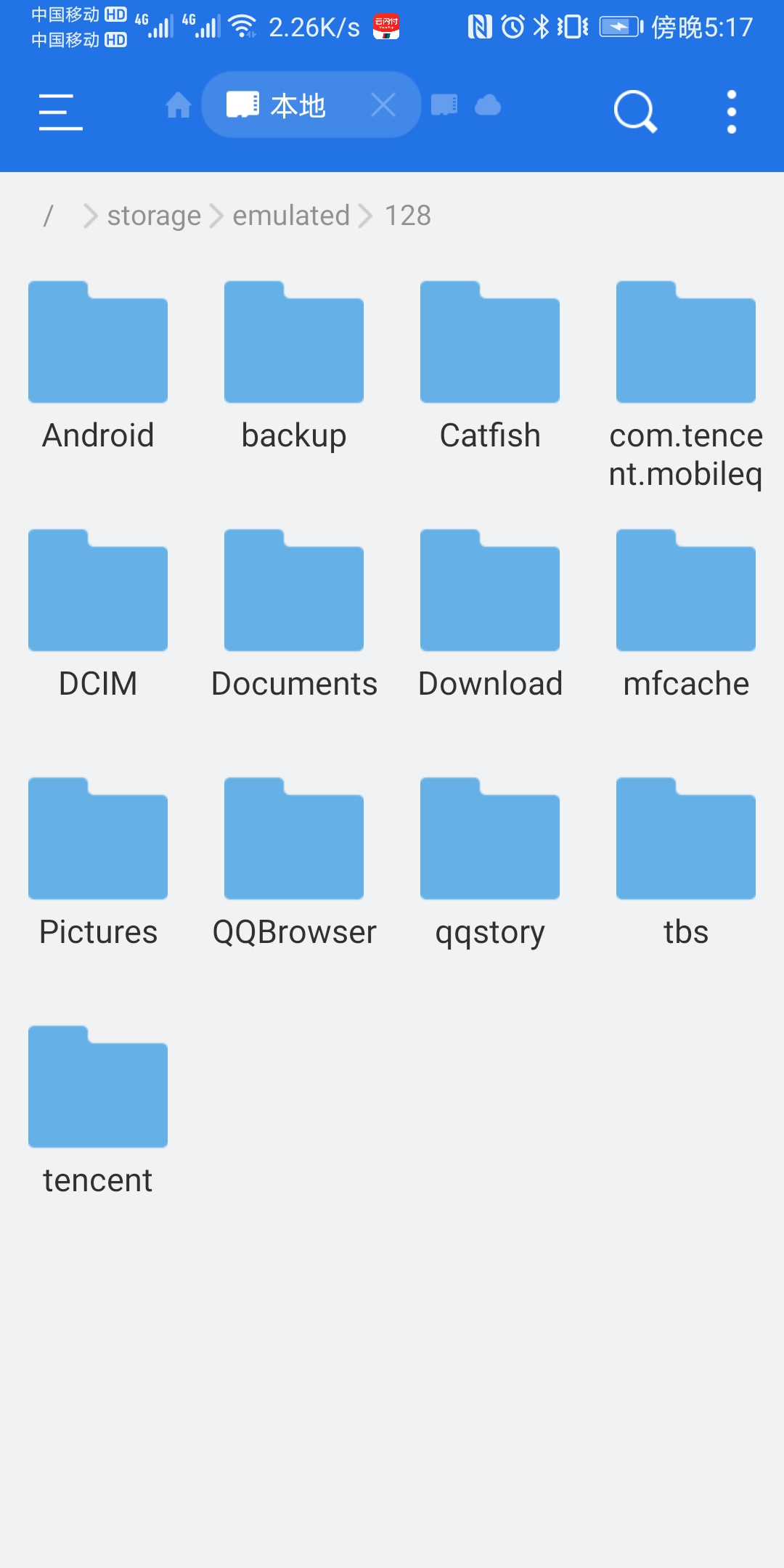 最近发现QQ分身下载的文件在文件管理器中无法找到,在QQ文件管理中看到位置是/storage/emulated/128,如下图所示: