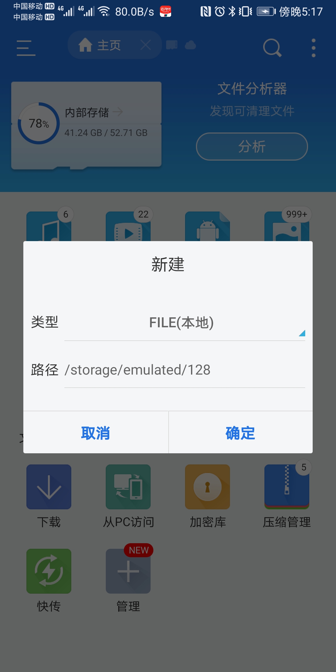 选择新建,输入“/storage/emulated/128”这个地址,即可打开该位置。