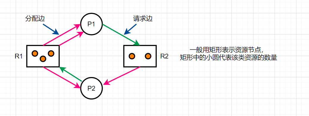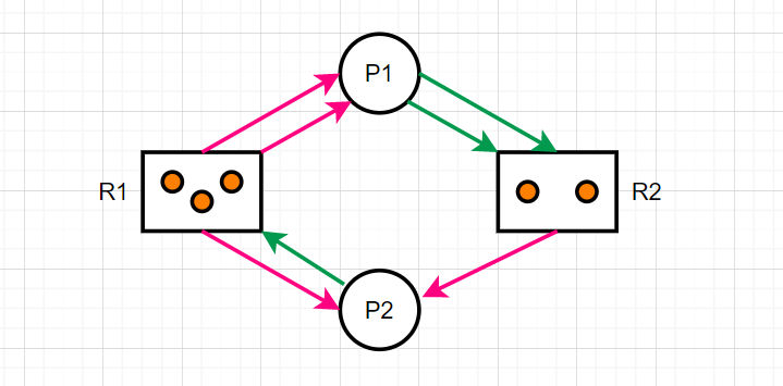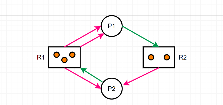 如图所示,P1需要两个R2资源,而R2有一个资源被P2占据,P2在请求一个R1资源,R1的两个资源被P1占据了。