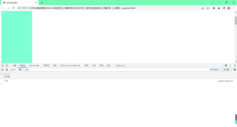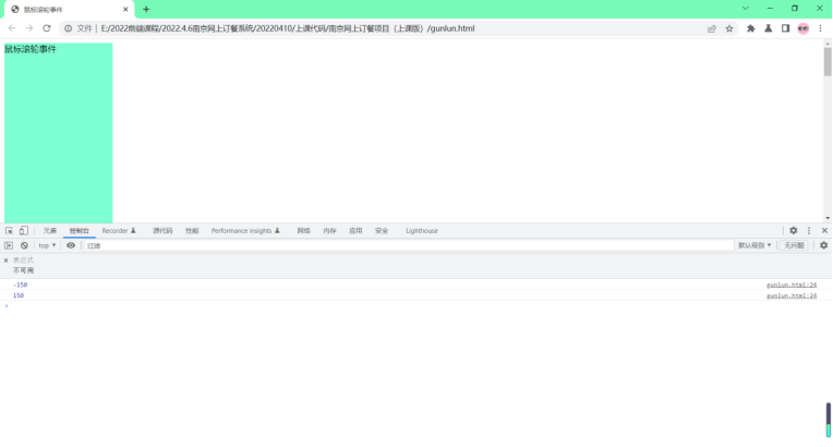 5.这是谷歌浏览器,检查然后点控制台查看。当鼠标向下滚动时,wheelDelta的值为-150,即wheelDelta<0(当wheelDelta的值为-150,即wheelDelta<0 鼠标向下滚动)