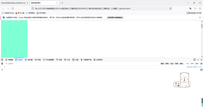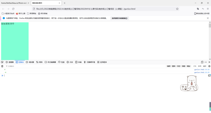 8.这是火狐浏览器,打开检查然后点击控制台查看。当鼠标向下滚动时,detail的值为4,即detail>0(当detail的值为4,即detail>0 鼠标向下滚动)