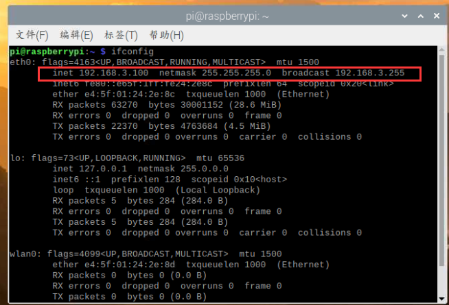 回到Raspberry Pi 的桌面后,点击“终端”,输入 ifconfig 回车