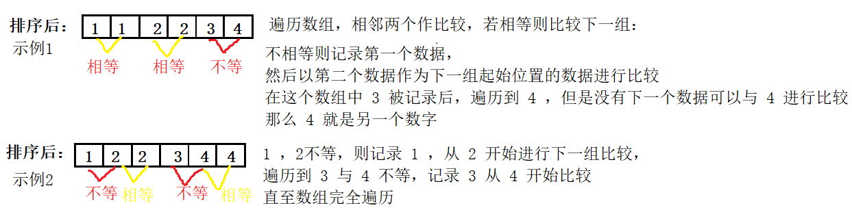 方法1:代码链接 对数组进行排序,排序后比较相邻数字是否相同。图示: