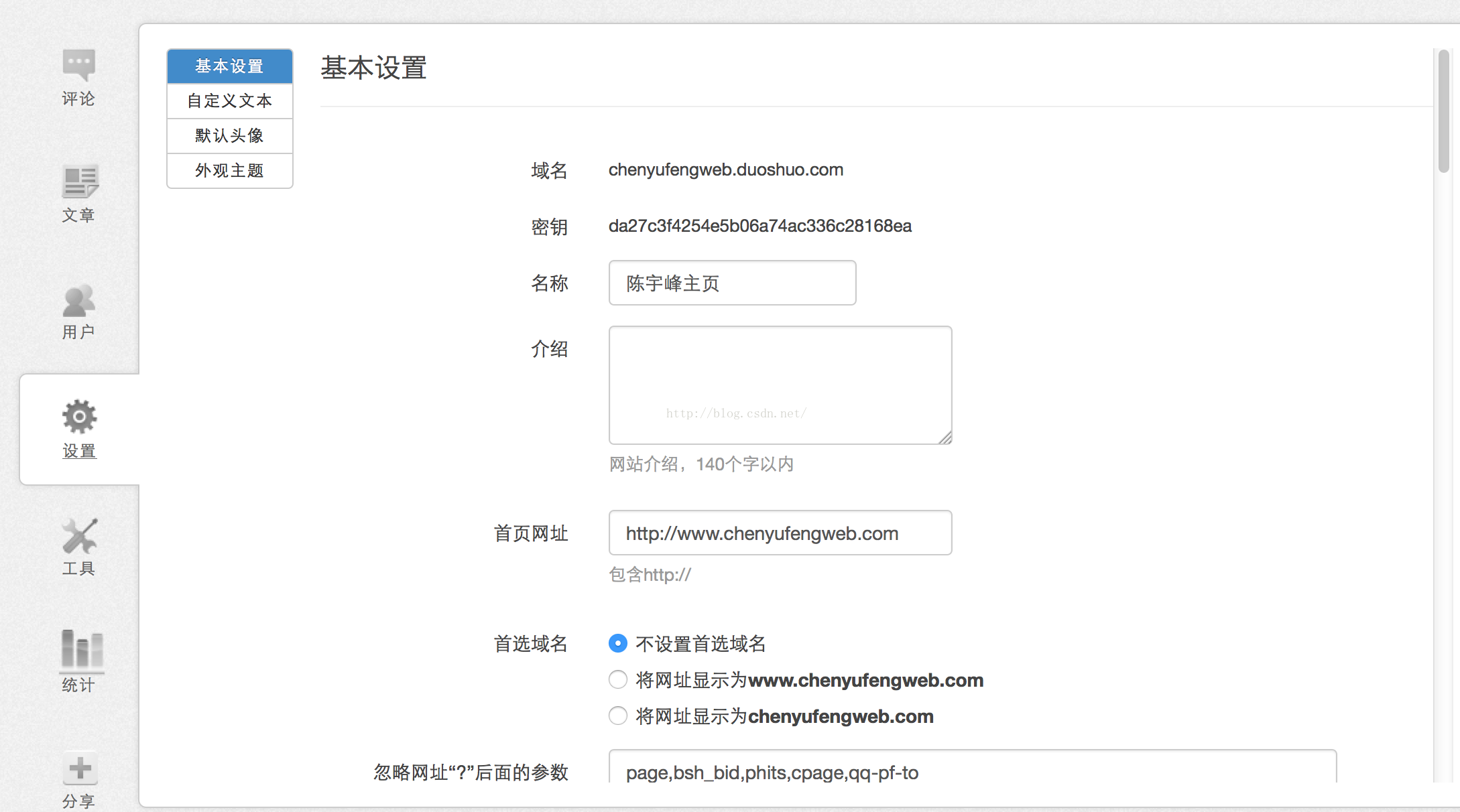 (2)然后进入到基本设置中,输入简单的信息,你将会获得一个多说的二级域名,*****.duoshuo.com. 如下面中的“chenyufengweb”