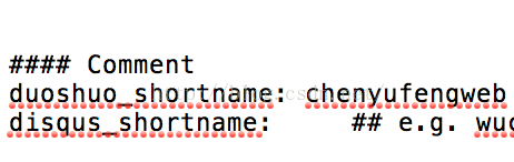 (3)然后进入jacman主题根目录下的_config.yml文件,进行简单的配置。在duoshuo_shortname后面输入上面获得的二级域名删除.duoshuo.com. 如你可以填入duoshuo_shortname: chenyufengweb. 注意:冒号后面应该要有个空格。
