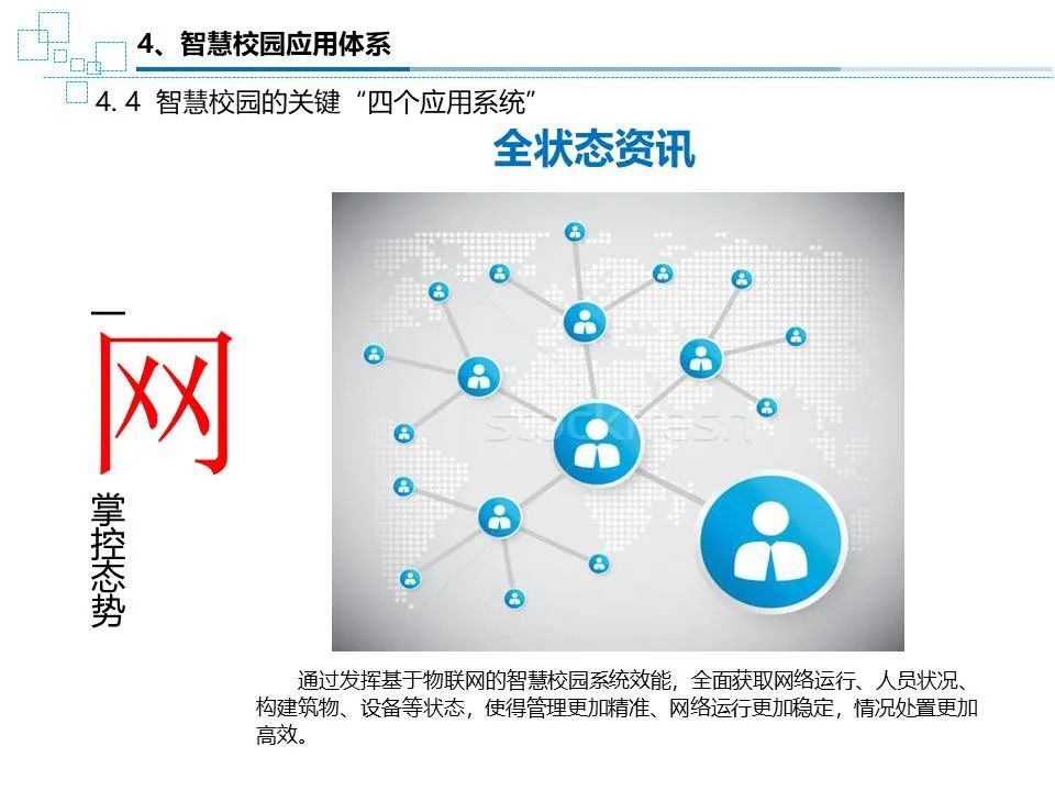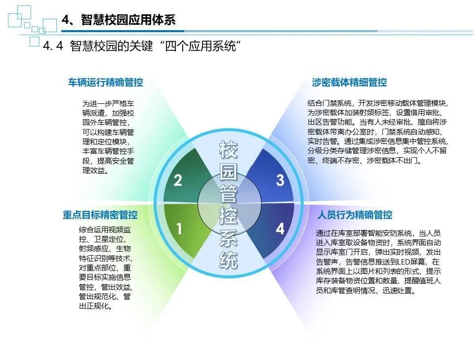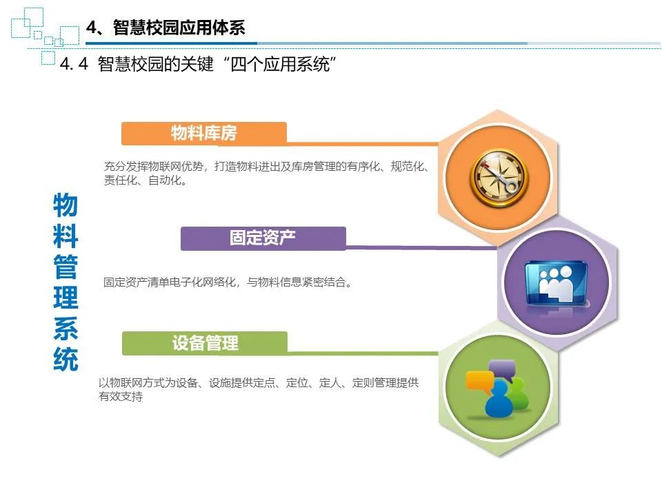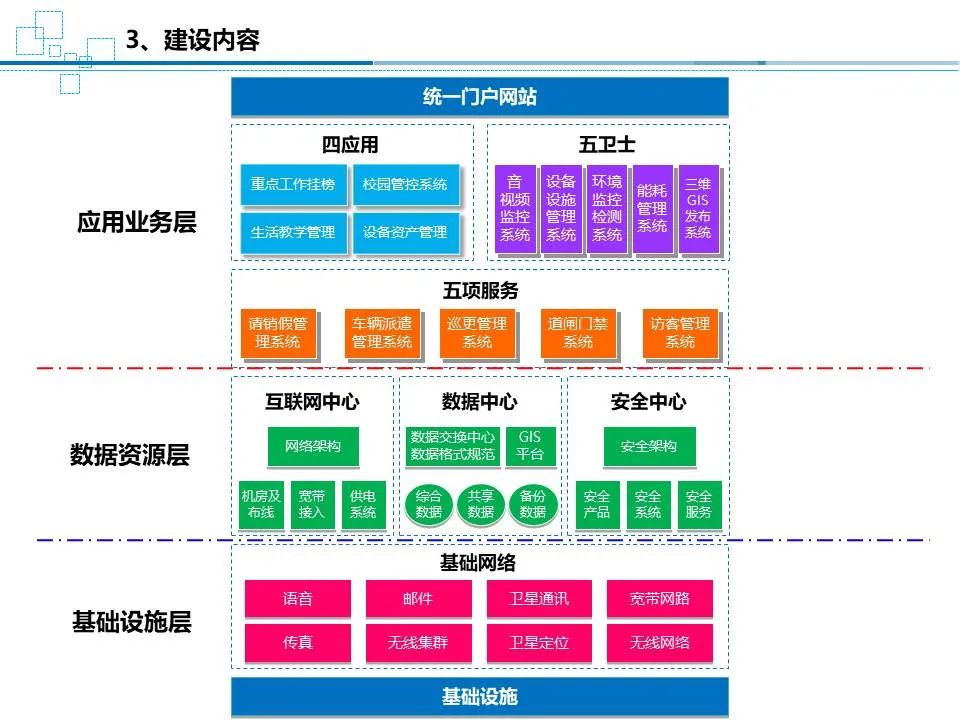 实现后勤保障体系以及被保障单元之间连成—体化的保障网络,提高管理水平和综合保障能力。智慧校园应用体系