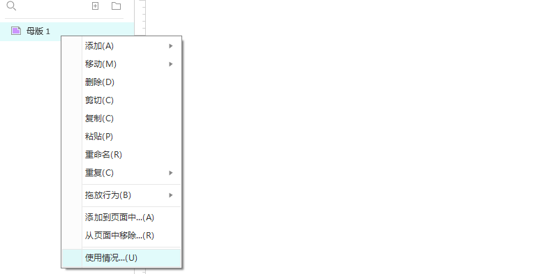 为了便于查看和修改母版,AXURE提供了母版的使用情况记录。在母版窗格中点击右键,然后选择使用情况。
