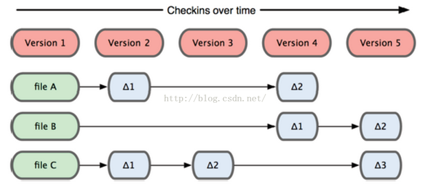 SVN只关心文件内容的具体差异。每次记录有哪些文件作了更新,以及都更新了什么内容。如下图所示: