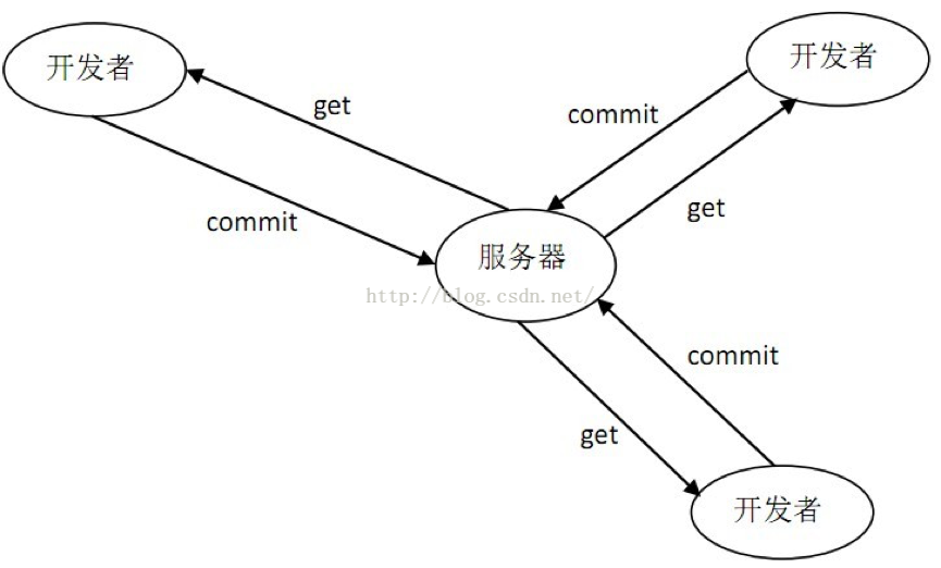 最早广泛应用的版本管理工具是CVS(Concurrent Versions System),后来逐渐被SVN(Subversion)替代,两者的工作原理类似,都是以一台服务器为核心进行集中式代码管理: