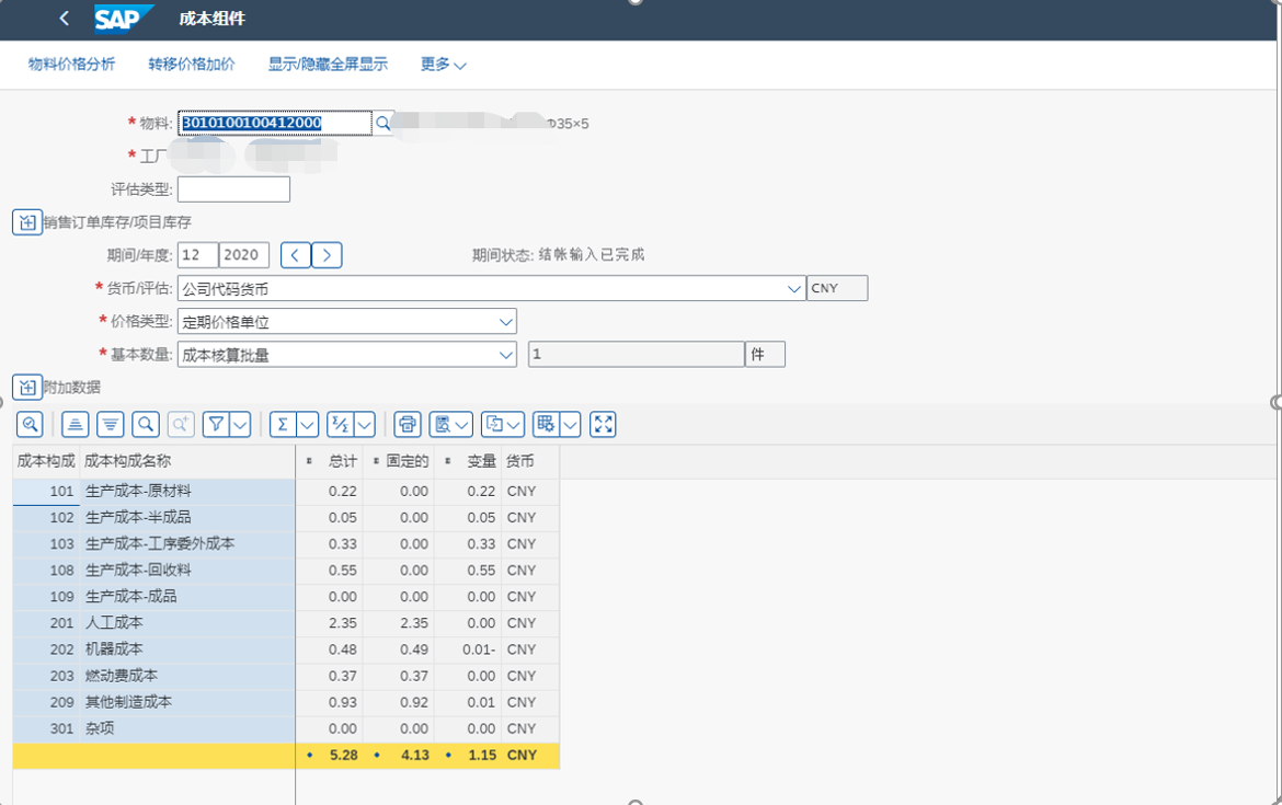 所在单位是制造企业,应用了SAP Cloud产品一年半的时间了,财务部门每次结完账后,需要知道各个生产部门、各个产品大类的成本组成。例如,2020年10月份结账后,利润表的营业成本是2600万元,那么其中原材料、人工、折旧、燃动、其他等按照系统中划分占成本的比例是多少!