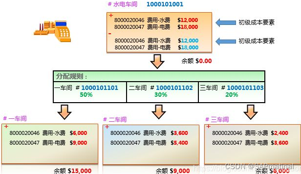 分配是将费用以原始成本要素(初级成本要素)的形式从发送方转到接收方;分摊是将费用以次级成本要素的形式从发送方转到接收方。例如,某公司水电车间归集的水电费用明细如下图,定义水电车间的费用按固定比例分配到生产车间。