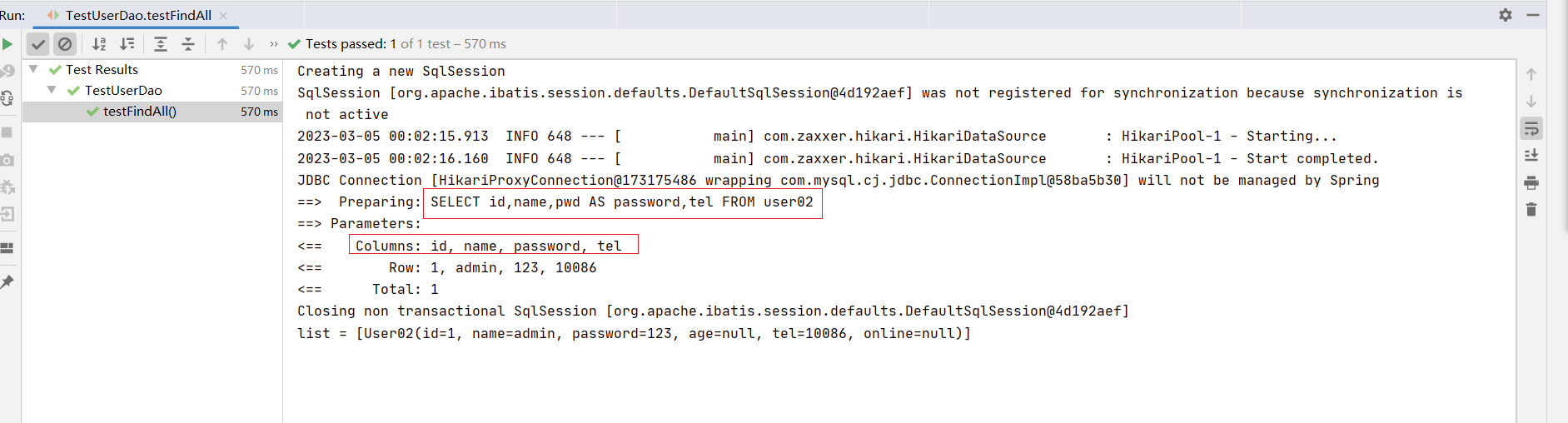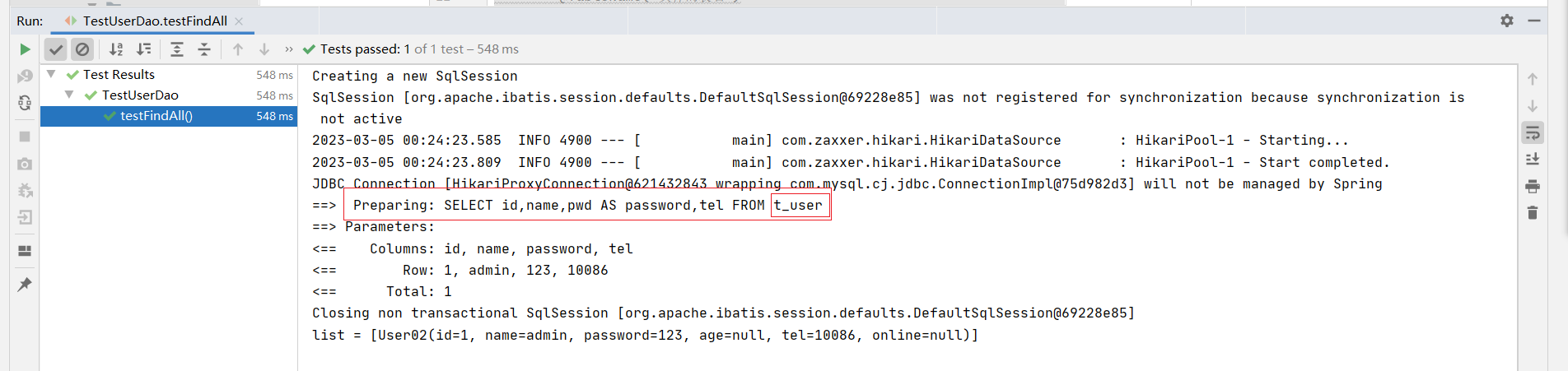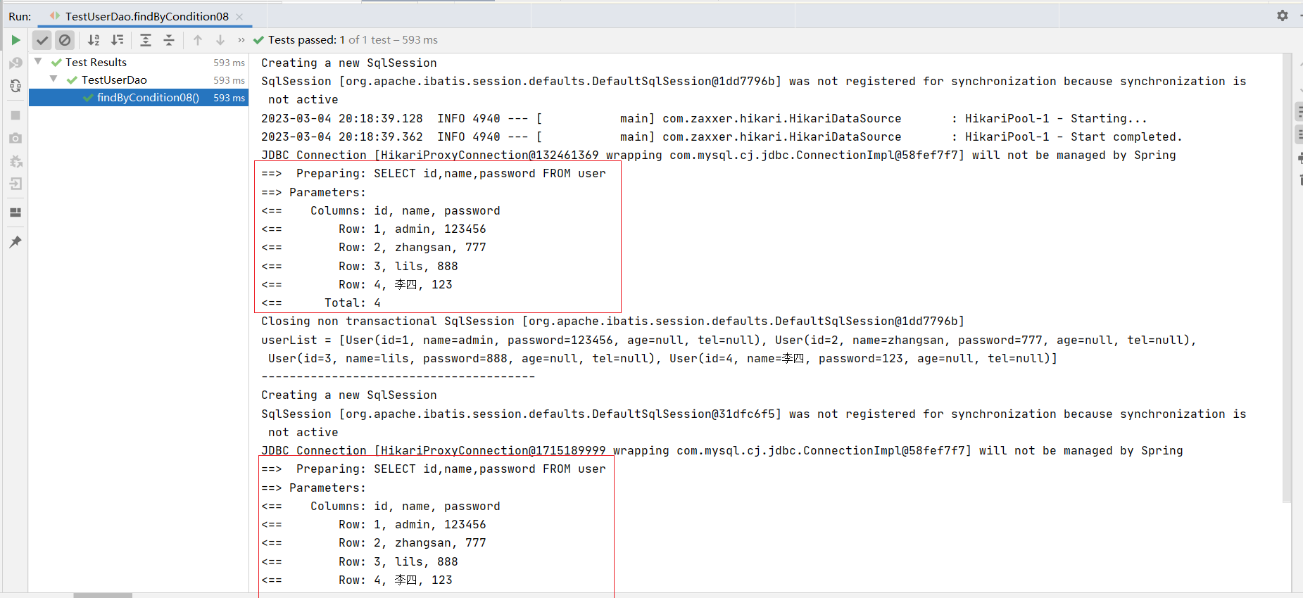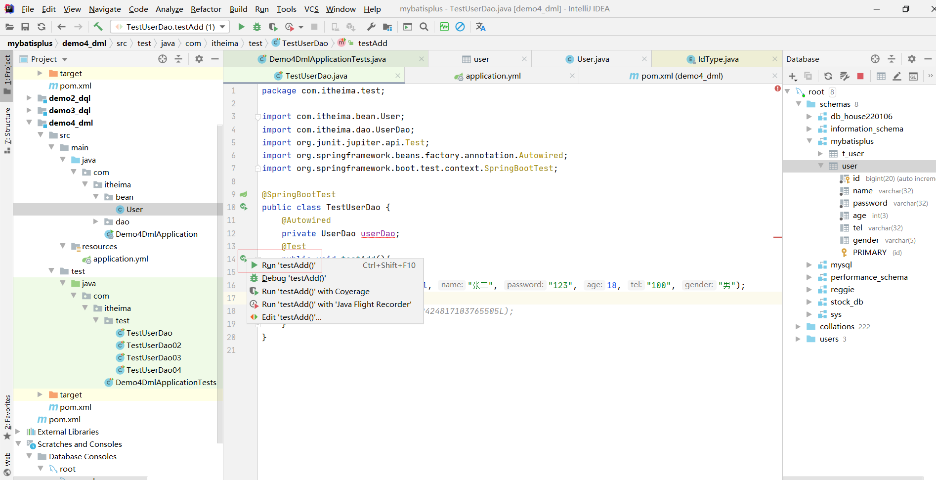 ⑦:测试类中注入dao接口,测试功能