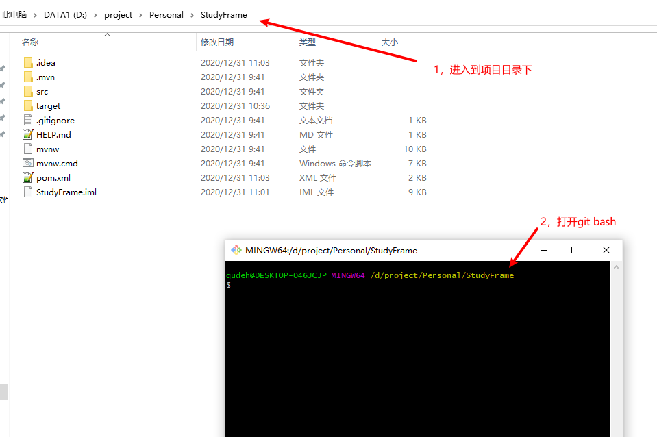 由于本地没有初始化仓库,我们选择上述第一个命令,如下在git bash下执行