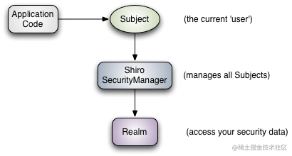 从整体概念上理解,Shiro 的体系架构有三个主要的概念:Subject (主体,也就是用户),Security Manager (安全管理器)和 Realms (领域)。 下图描述了这些组件之间的关系:
