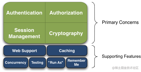 Apache Shiro 是一个具有许多功能的综合型应用程序安全框架。 下图为 Shiro 中的最主要的几个功能: