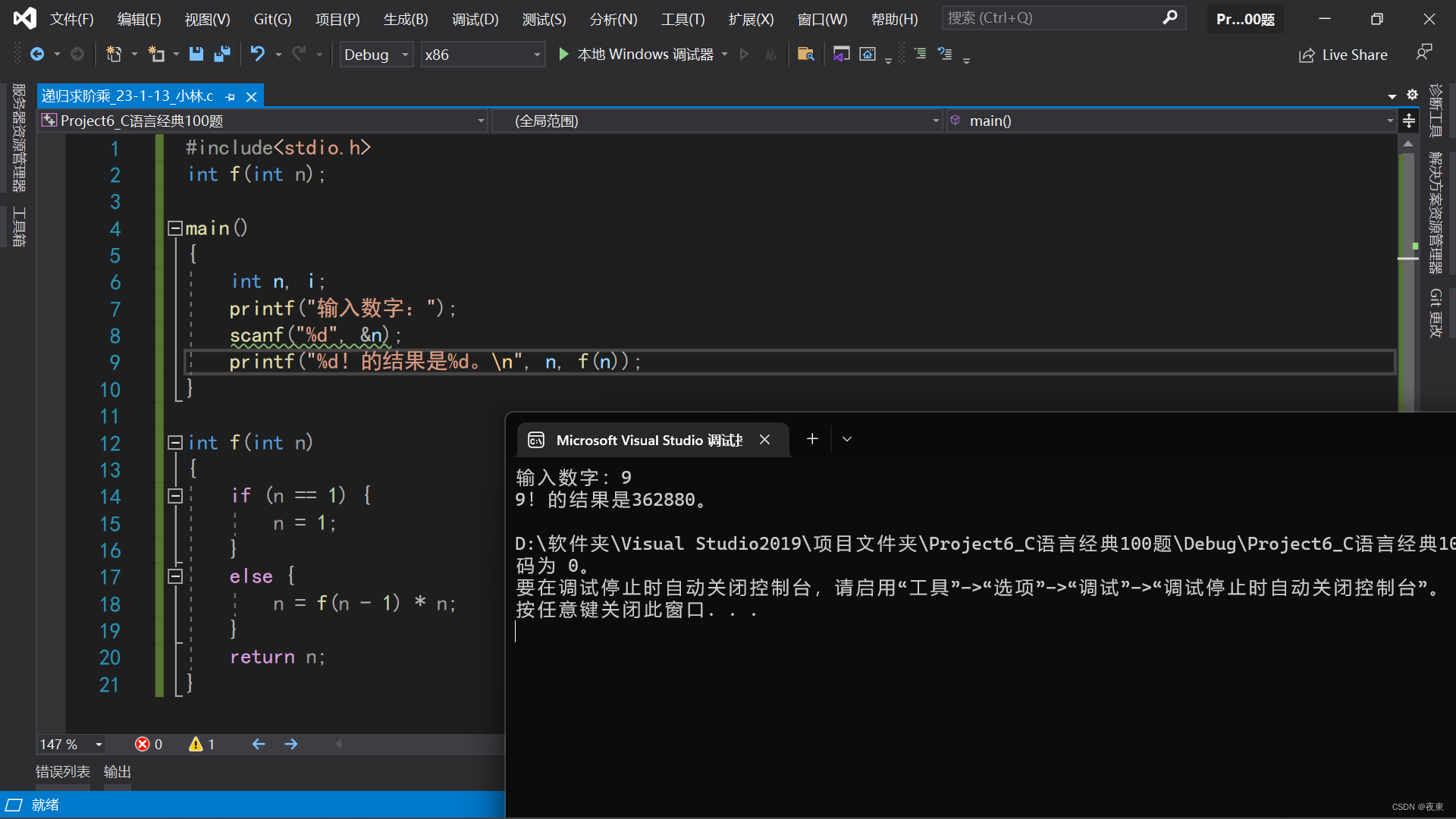 printf("%d!的结果是%d。n", n, f(n));