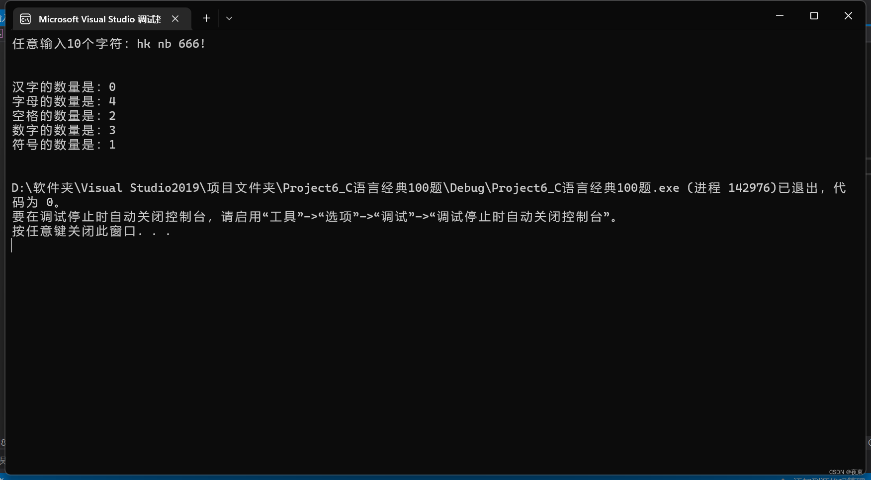 printf("字母=%d,数字=%d,空格=%d,其他=%dn",letters,digits,spaces,others);