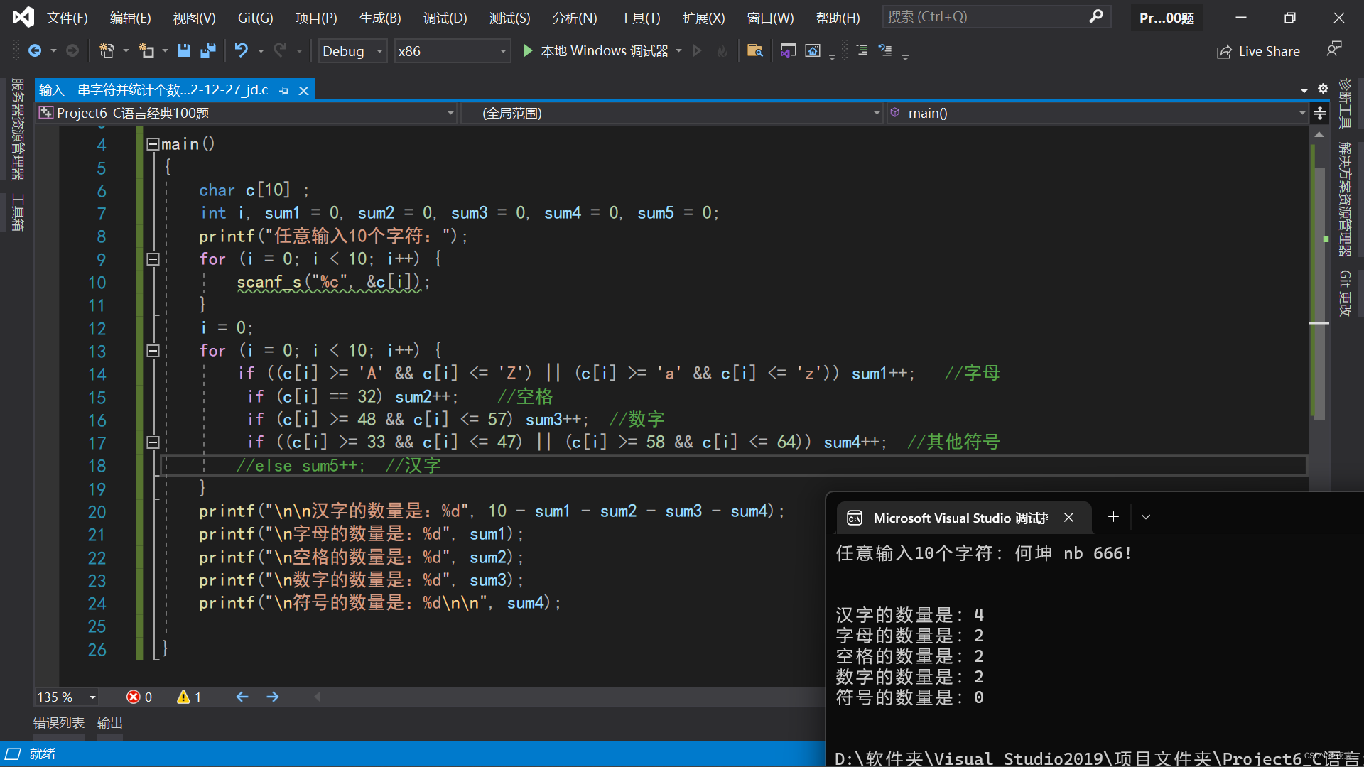printf("nn汉字的数量是:%d", (10 - sum1 - sum2 - sum3 - sum4)/2);