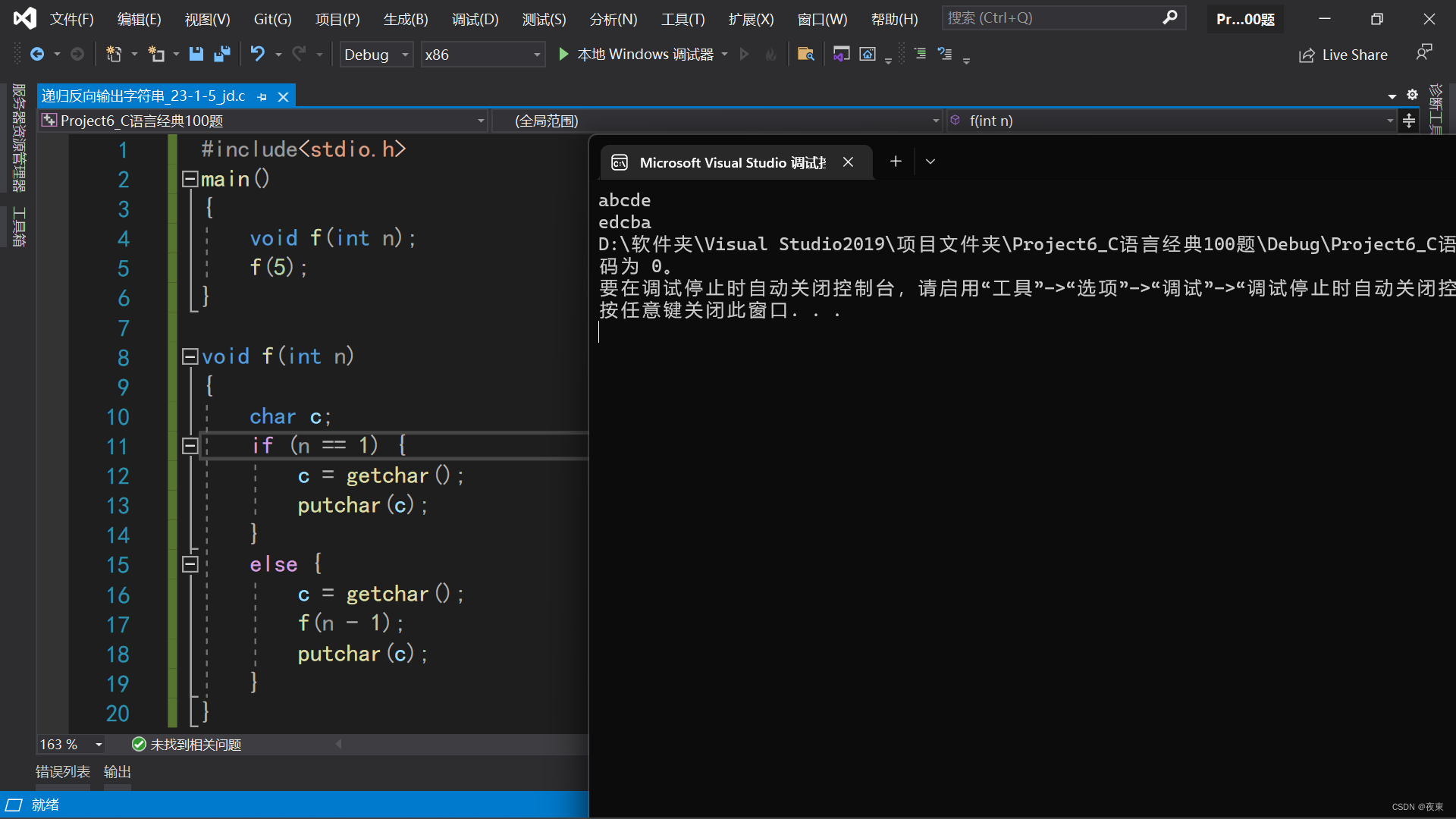利用递归函数调用方式,将所输入的5个字符,以相反顺序打印出来。