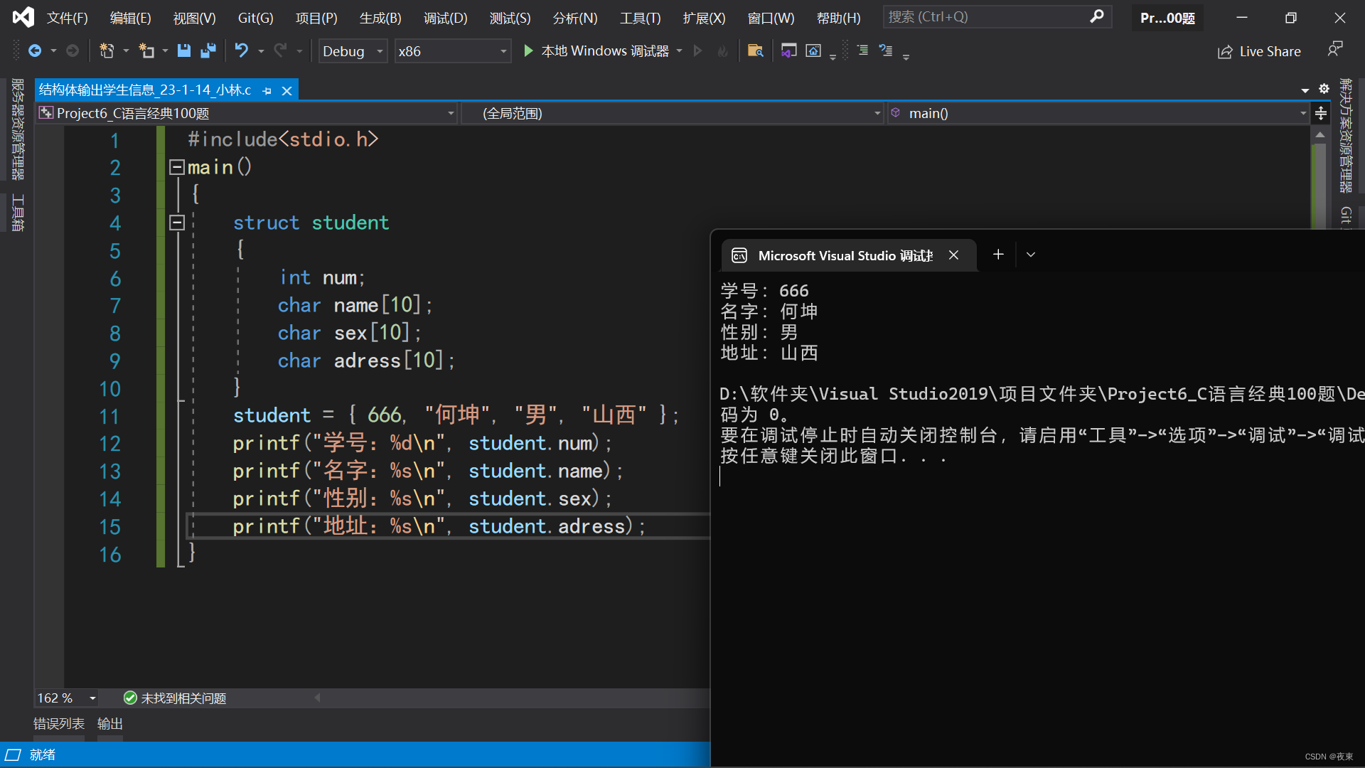 C语言实现把一个学生的信息 (包括学号、姓名、姓名、地址)放在一个结构体变量中。然后输出这个学生的信息。
