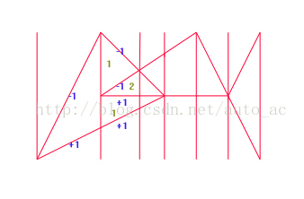以图中第二条和第三条竖线之间的面积为例, 最下面的一块一定是计算0次的,度为0, 那么当它从下往上经过第一条边时,度加1,那么上面一块的梯形就是覆盖一次,再网上穿过一条线段,度再加1,所以这块三角形的被覆盖了两次,接下来都是类似的情况, 知道扫完所有两条竖线之间的线段为止。