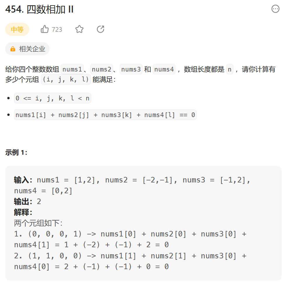以上就是单纯方盒最近收集整理的关于力扣 454. 四数相加II来源:题目描述:思路:代码实现:的全部内容,更多相关力扣内容请搜索靠谱客的其他文章。