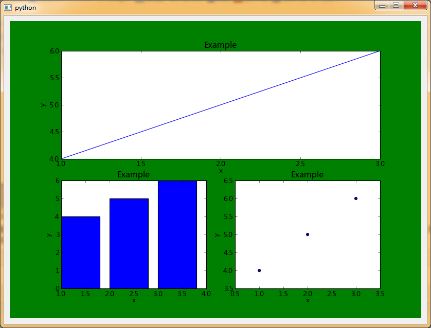 example2: 多figure在widget上的显示,我用了一种比较笨的方法,采用了多canvas和多figure的办法,然后在widget上面使用布局管理器控制布局,我记得是有一种方法可以用一个canvas将多figure显示出来的,方法记不起来了,就附上这个比较笨的替代方法。(代码中可以忽略class Example这一段,这些是不同的widget,最后widgetObject.show()方法显示指定的widget)