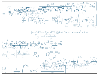 #挺有意思的一个文本显示的图片,可以自定义内容,网上有一些叫做词云可视化的东东就是用很多字组成一个图片的大致轮廓。如果我们分析一张图片,分析出其大致的轮廓然后在相应的像素点用axes代替是不是也可以做出来相应的效果?图像轮廓提取方法研究? from pylab import * eqs = [] eqs.append((r"$W^{3beta}_{delta_1 rho_1 sigma_2} = U^{3beta}_{delta_1 rho_1} + frac{1}{8 pi 2} int^{alpha_2}_{alpha_2} d alpha^prime_2 left[frac{ U^{2beta}_{delta_1 rho_1} - alpha^prime_2U^{1beta}_{rho_1 sigma_2} }{U^{0beta}_{rho_1 sigma_2}}right]$")) eqs.append((r"$frac{drho}{d t} + rho vec{v}cdotnablavec{v} = -nabla p + munabla^2 vec{v} + rho vec{g}$")) eqs.append((r"$int_{-infty}^infty e^{-x^2}dx=sqrt{pi}$")) eqs.append((r"$E = mc^2 = sqrt{{m_0}^2c^4 + p^2c^2}$")) eqs.append((r"$F_G = Gfrac{m_1m_2}{r^2}$")) axes([0.025,0.025,0.95,0.95]) for i in range(24): index = np.random.randint(0,len(eqs)) eq = eqs[index] size = np.random.uniform(12,32) x,y = np.random.uniform(0,1,2) alpha = np.random.uniform(0.25,.75) text(x, y, eq, ha='center', va='center', color="#11557c", alpha=alpha, transform=gca().transAxes, fontsize=size, clip_on=True) xticks([]), yticks([]) # savefig('../figures/text_ex.png',dpi=48) show()