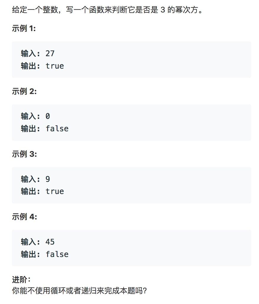 第一种解法比较常规,由于题目说了不能用循环和递归,所以首先想到的就是先找到最大的3的幂次方得数,然后就直接判断就完事了......