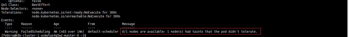 [fedora@k8s-cluster-1-ycmwlao4q5wz-master-0 ~]$ kubectl describe node k8s-cluster-1-ycmwlao4q5wz-minion-0|grep -i taints Taints: node.cloudprovider.kubernetes.io/uninitialized=true:NoSchedule