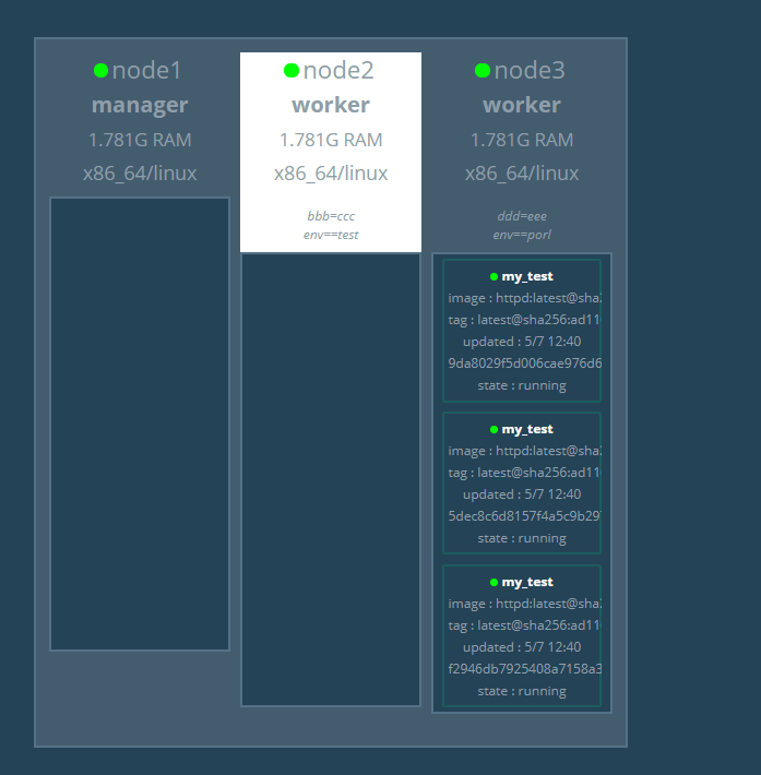 --constranint node.labels.env==test限制将service部署到label=test 的node,三个副本全部都运行在node2上。