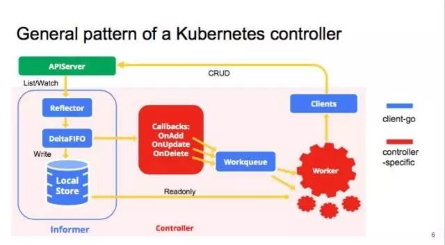 下面这张图很好的展示了一个 controller 的工作流程和原理,典型的 controller 一般会有一个或者多个 informer 来跟踪 resource,把最新的状态反映到本地的 cache 中。配图:来自徐超大神分享