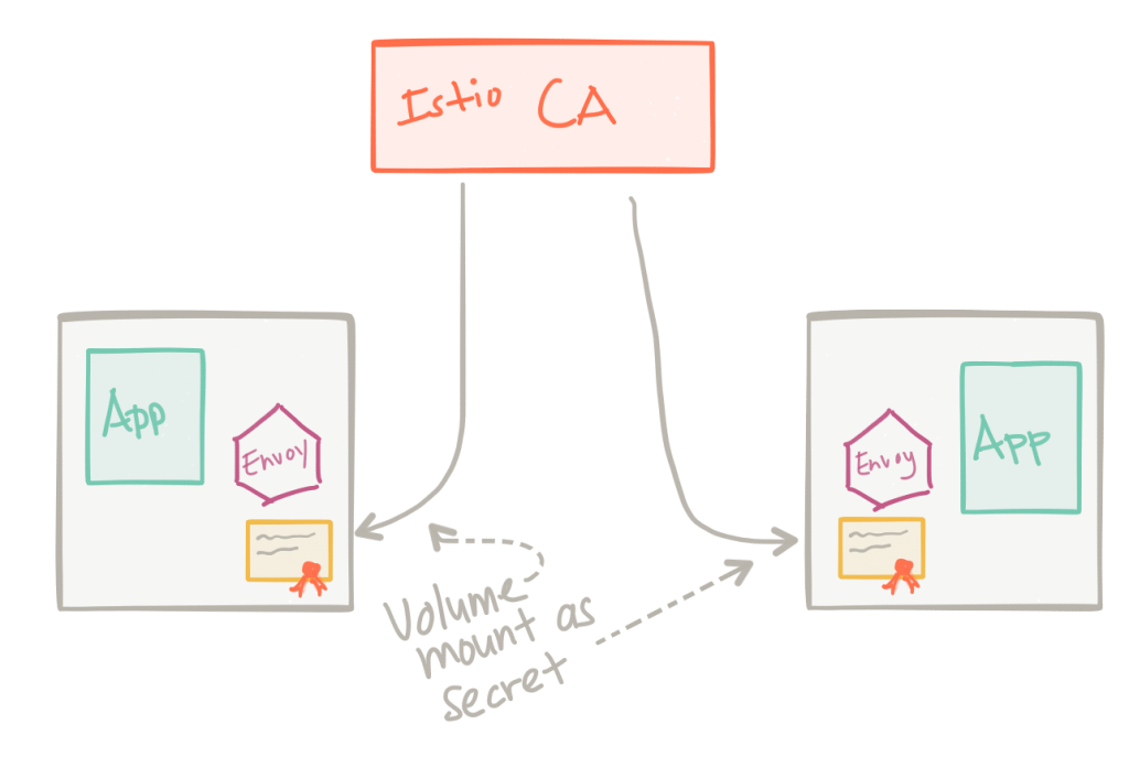 以Istio在Kubernetes上运行为例,每当部署应用程序时,都应分配一个应用程序应在其下运行的服务帐户–之后,istio负责其余工作。 Istio将为您的服务帐户创建一个证书/密钥对,并使用根CA密钥对证书进行签名,并在Kubernetes中将证书/密钥作为密钥颁发。 此秘密将安装到运行您的应用程序和Istio服务代理的Pod中,服务代理将使用cert / keys建立mTLS。