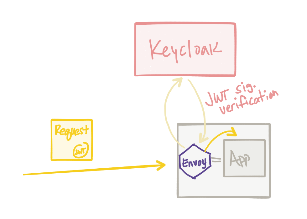 注意: 此示例来自我的同事 Kamesh Sampath 。 在此配置中,我们将Keycloak设置为JWT令牌的身份管理者和颁发者(遵循OpenID Connect)。 有关更多信息, 请参见此博客 。 当呼叫进入服务时,如果没有JWT Bearer令牌,则将拒绝该呼叫。 此配置将安装一个Envoy jwt过滤器 ,该过滤器实际上负责验证JWT的签名: