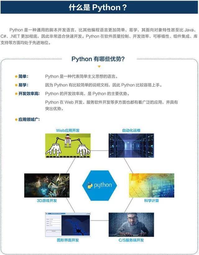 1、Python除了极少的事情不能做之外,其他基本上可以说全能,系统运维、图形处理、数学处理、文本处理、数据库编程、网络编程、web编程、多媒体应用、pymo引擎、黑客编程、爬虫编写、机器学习、人工智能等等都可以做。