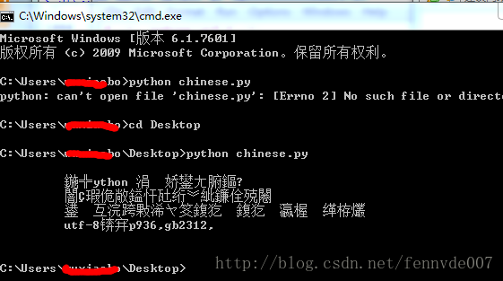 可以看到是乱码。这是因为,windows的命令行是采用的cp936编码,而上述的编码是utf-8,才导致乱码。解决的方案是,在脚本中使用decode和encode函数对上述的字符重新解码和编码。
