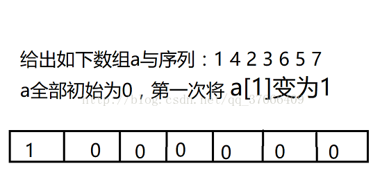 如上图,第一次将第一个数1对应的a[1]++,这时还看不出来,再将4对应的a[4]++,同理a[2]++……即将n对应的a[n]++,这样做,就可以将一个无序的序列变得有序,同时a数组也表示了对应下标的数是否出现/处理过,而且当只有i个元素变换之时,剩余元素不会对接下来的操作造成影响,现在给出计算到2时的图片: