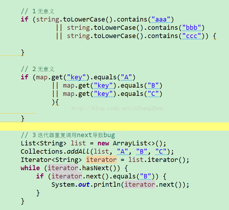 相同的代码出现第二次的时候就应该考虑复用了,对于1 、 2这种代码,实在看得我难受。他们连迭代器都没用过吗,如果用过的话,肯定会知道这种重复代码一般情况下没问题,但在迭代器里这么用就是有bug的呀,从而就不会这么写了,或者了解过eclipse快捷键,也不会这么写了,直接一个快捷键完事。或者想过去重构一下,也不会出现这种代码了。