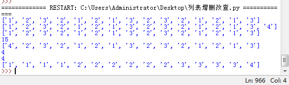grades = list('123212132321213') print(grades) grades.append('4') print(grades) grades.pop(-1) print(grades) print(len(grades)) grades[0] = '4' print(grades) print(grades.count('1')) print(grades.count('3')) grades.sort() print(grades)