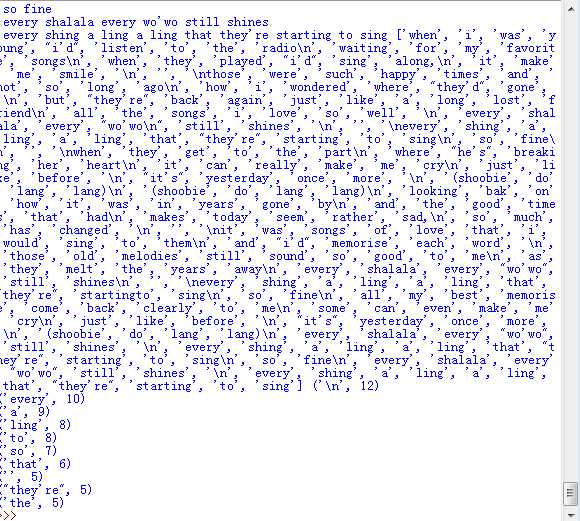 news = '''When I was young I'd listen to the radio Waiting for my favorite songs When they played I'd sing along, It make me smile. Those were such happy times and not so long ago How I wondered where they'd gone. But they're back again just like a long lost friend All the songs I love so well. Every shalala every wo'wo still shines. Every shing-a-ling-a-ling that they're starting to sing so fine When they get to the part where he's breaking her heart It can really make me cry just like before. It's yesterday once more. (Shoobie do lang lang) (Shoobie do lang lang) Looking bak on how it was in years gone by And the good times that had makes today seem rather sad, So much has changed. It was songs of love that I would sing to them And I'd memorise each word. Those old melodies still sound so good to me As they melt the years away Every shalala every wo'wo still shines Every shing-a-ling-a-ling that they're startingTo sing so fine All my best memorise come back clearly to me Some can even make me cry just like before. It's yesterday once more. (Shoobie do lang lang) Every shalala every wo'wo still shines. Every shing-a-ling-a-ling that they're starting to sing so fine Every shalala every wo'wo still shines. Every shing-a-ling-a-ling that they're starting to sing'''