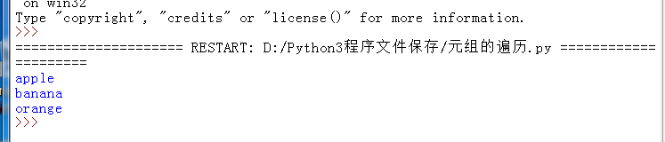 fruits=("apple","banana","orange") for i in range(len(fruits)): print(fruits[i])