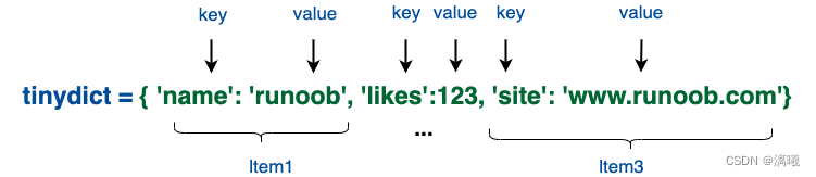 tinydict = {'Name': 'Runoob', 'Age': 7, 'Class': 'First'}