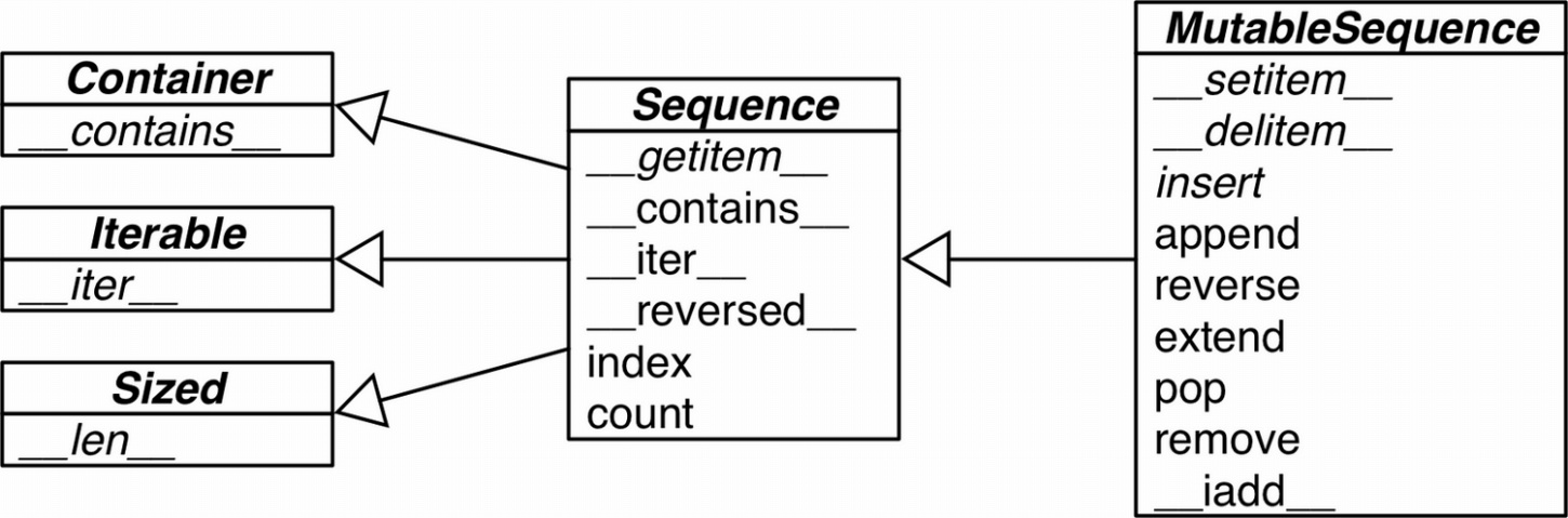 下图展示了可变序列(MultableSequence)和不可变序列(Sequence)的差异(注:python内置的序列类型并不是直接从Sequence和MultableSequence这两个抽象基类(ABC)集成而来的):