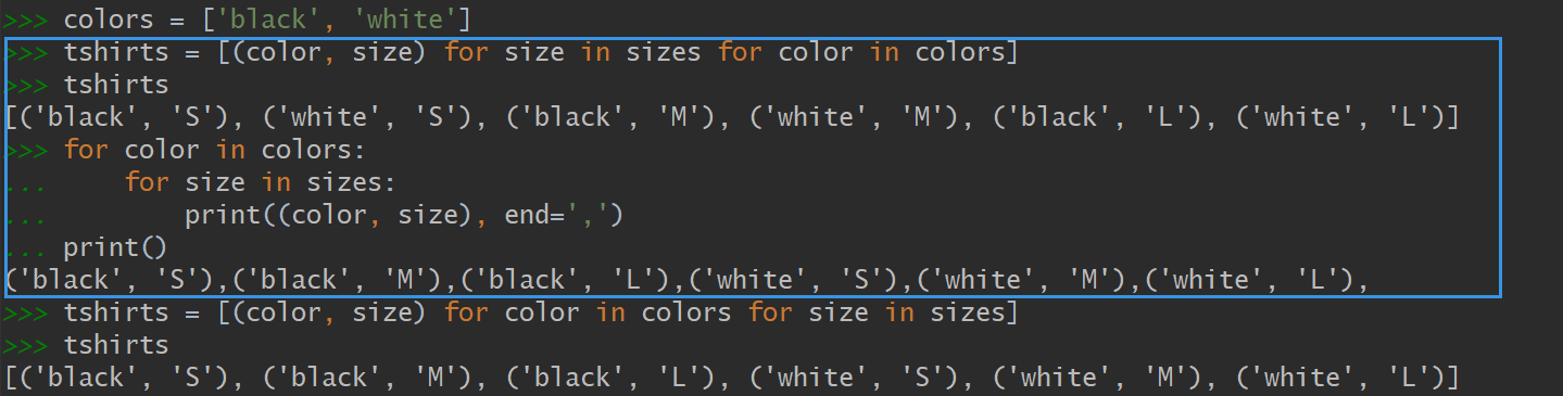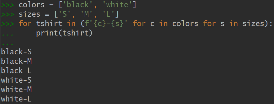用到生成器表达式之后,内存里不会留下一个有6个组合的列表,因为生成器表达式会在每次for循环运行时才生成一个组合。如果要计算1000个元素的列表的笛卡尔积,生成器表达式就能帮忙省略掉for循环的开销,即一个含有100万个元素的列表。