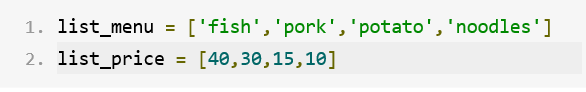 字典和列表一样,都是 Python 中十分重要的可变容器模型,都可以存储任意类型元素。我们将以菜单的例子来说明字典使用的基本知识,餐馆的菜单上不仅包含菜名,菜名后面还必须包含该道菜的价格。如果要用列表实现,就需要两个列表,例如: