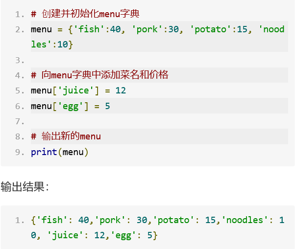 新的menu字典包含666个键-值对,新增加的两个键-值对(菜名和对应价格)添加在了原有键-值对的后面。