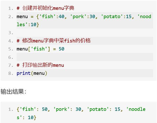 字典和列表一样,里面的值都是可以修改的。要修改字典中的值,可直接指定字典中的键所对应的新值。例如,将menu中的fish价格改为50: