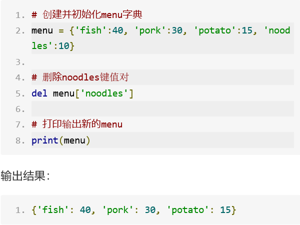 我们可以通过del方法删除字典中不需要的键-值对。使用del方法时,要指定字典名和要删除的键。例如,在menu菜单中删除键noodles和它的值: