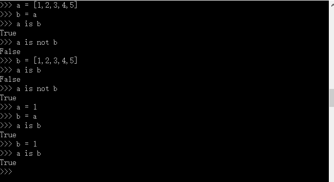 在上面例子中,在对a、b分别进行列表赋值时,python分别为a b 创建了不同的对象,即使两者的值相等,a b本身仍不相等;