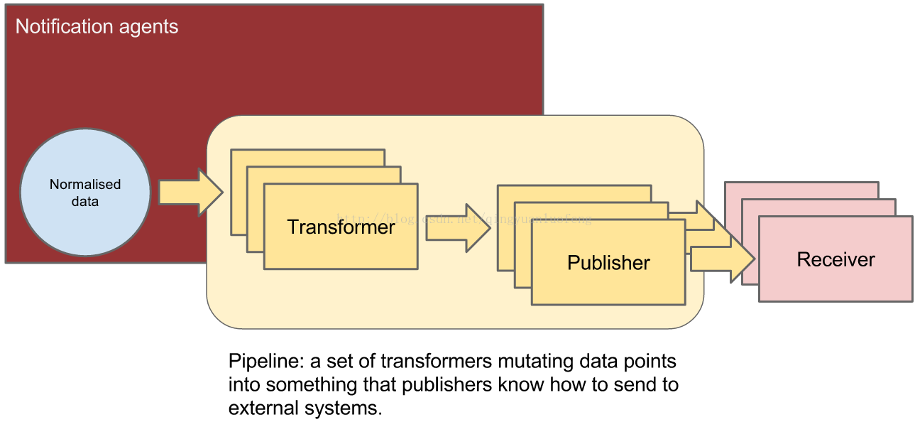 2) notification agent:通知代理,守护进程,监听消息队列的通知,并将它们转化为事件和采样值,并且应用到管道pipeline动作。